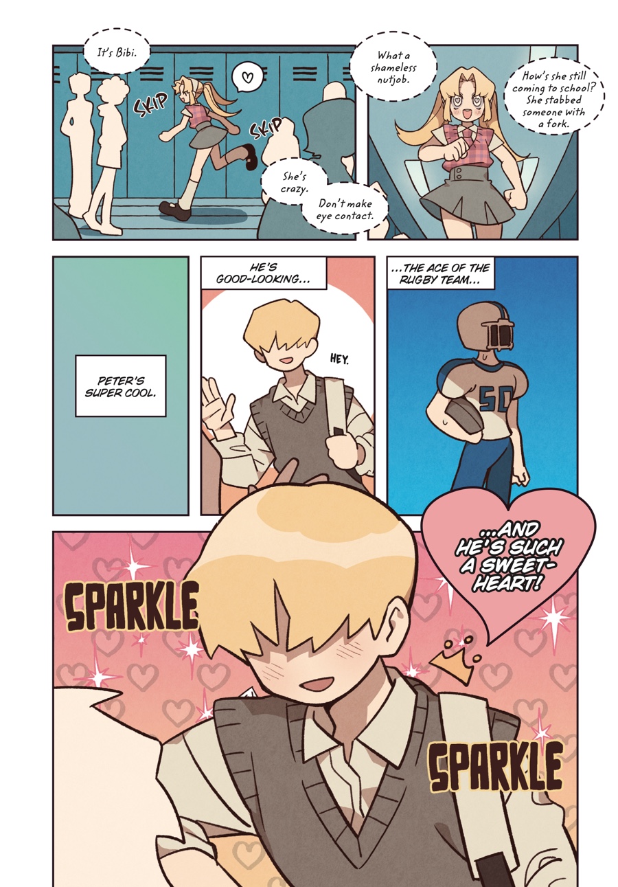 Bibi loves Peter. And Peter would love Bibi…if not for that pesky girl Peter was talking to in the school hallway! Bibi needs her out of the way, so she invites her new rival over for “a sleepover”. But instead of making sure the girl from the halls won’t get in her way any further, Bibi enjoys a pleasant night with her new friend, Amy. As they fall asleep, Bibi wrestles with an unfamiliar and confusing feeling. Something must be wrong, because Bibi loves Peter…right?